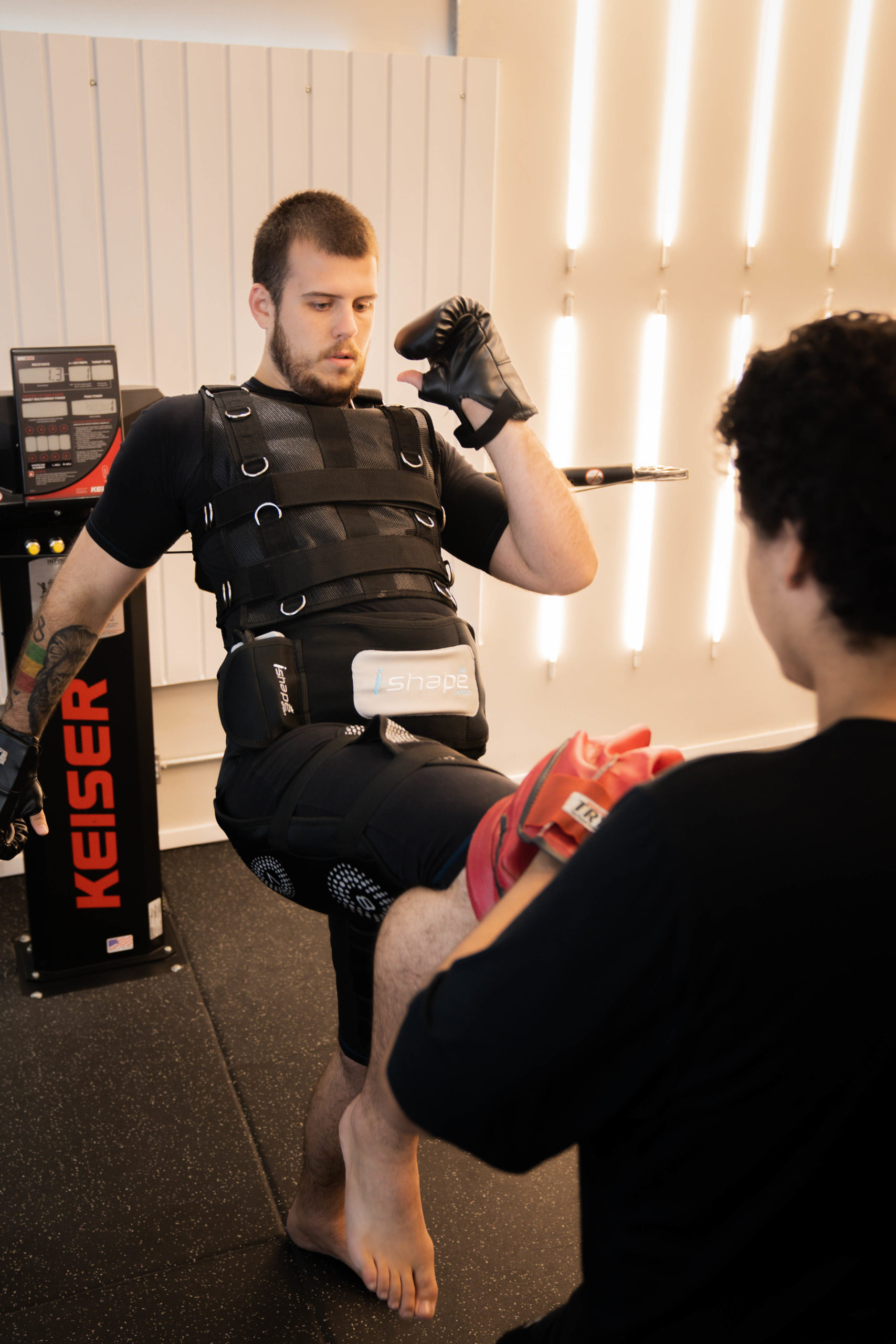 A eletroestimulação consiste na utilização de correntes elétricas para estimular a contração muscular involuntária. Para isso, são usados cerca de 20 eletrodos sobre o corpo para obter o resultado desejado. O objetivo da eletroestimulação é trabalhar as fibras musculares ao extremo, sem causar fadiga — o que geralmente acontece em treinos pesados. A corrente elétrica usada no tratamento passa pelos nervos motores que vão estimular as fibras musculares. Esse tipo de estímulo compete com a transmissão do impulso doloroso e, por isso, acaba diminuindo a percepção de dor. Essa corrente também age no sistema nervoso central, liberando a produção de endorfina, endomorfina e encefalinas, o que também contribui para o bloqueio da sensação de fadiga e cansaço.
