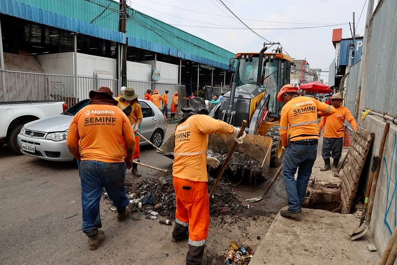 A Prefeitura de Manaus, por meio da Secretaria Municipal de Infraestrutura (Seminf), realizou nesta quinta-feira (21/11) um mutirão de limpeza e desobstrução das caixas coletoras na rua dos Barés, localizada entre a Feira da Banana e a Manaus Moderna, no Centro da capital. A ação faz parte do cronograma preventivo para minimizar os impactos das chuvas torrenciais no período chuvoso.