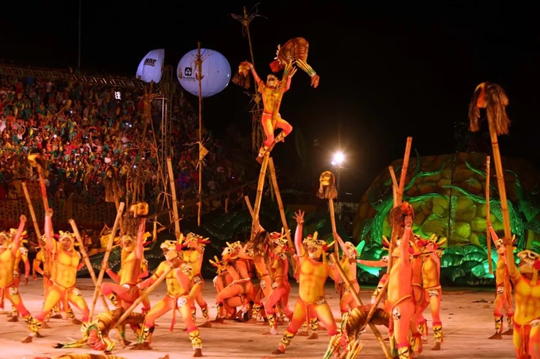 Em Parintins, o duelo entre Caprichoso e Garantido transforma o folclore em espetáculo.
